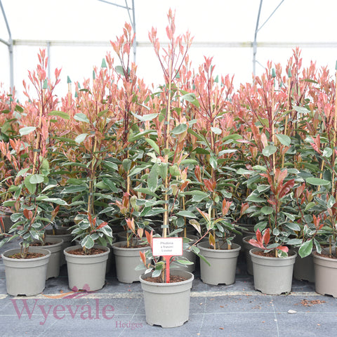 Distinguished by its elegant variegated foliage, this evergreen shrub showcases striking cream and green leaves edged with a delicate pink flush when young, maturing to a sophisticated palette of grey green with creamy white margins. The colourful new growth emerges with a soft rose tint, creating a subtle yet captivating display that sets it apart from other photinias. Compact and neatly bushy in habit, it forms an excellent low hedge or adds refined structure to mixed borders without overwhelming smaller garden spaces. Small white flowers appear in spring, occasionally followed by ornamental red berries. Particularly resilient in urban environments, it thrives in sun or partial shade while tolerating pollution and a range of soil conditions with minimal maintenance required.